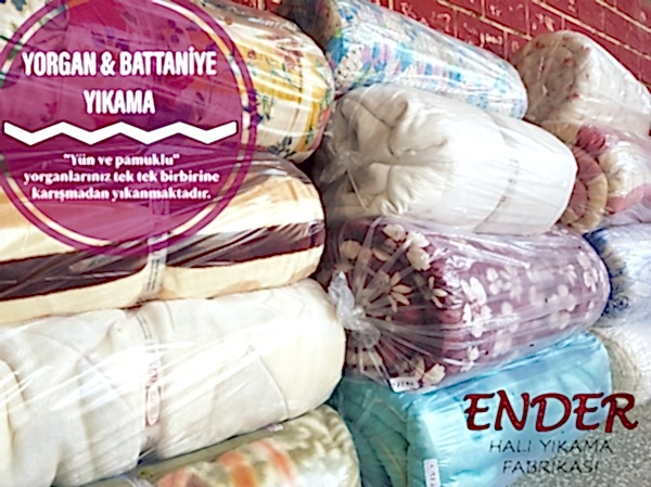 "Ender Halı Yıkama" diğer firmalardan farklı olarak fabrikamıza gelen yorgan ve battaniyelerinizi toplu olarak değil tek tek fırçalı temizleyerek daha sağlıklı ve hijyenik bir temizliğe kavuşturur. Bu yöntemle farklı adreslerden alınan yorgan ve battaniyelerin kirleri birbirine karışmadan ilk günkü temizliğine kavuşmuş olur. Yıkama işlemi;